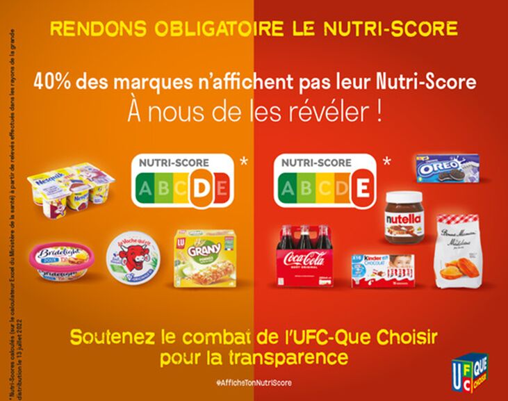 Alors que la Commission européenne va au cours des prochaines semaines décider du sort du Nutri-Score, l’UFC-Que Choisir mène une campagne de terrain grâce à ses associations locales pour dénoncer en magasin les marques n’affichant pas le Nutri-Score et pour mobiliser les consommateurs afin qu’ils fassent connaître à la Commission européenne, directement sur les réseaux sociaux, leur soutien à cet étiquetage nutritionnel.