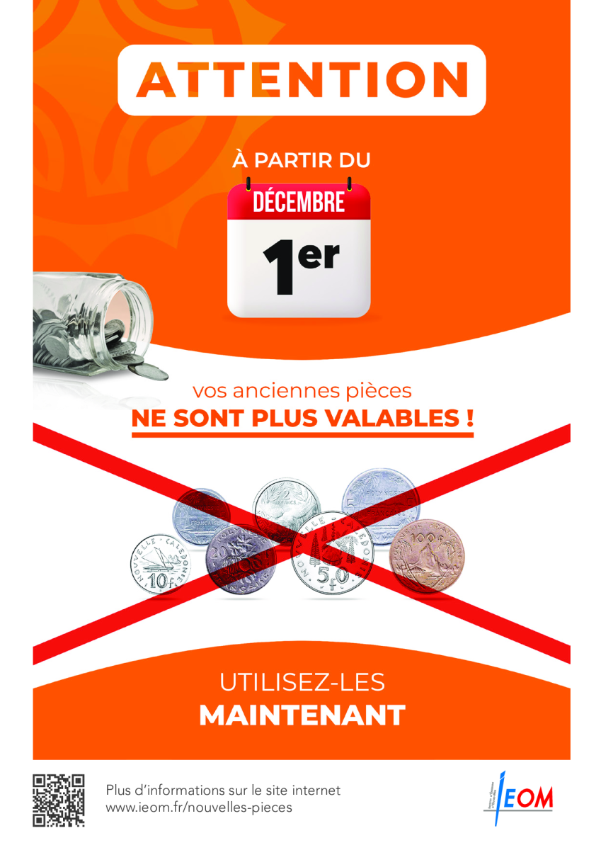 L’Institut d’émission d’outre-mer (IEOM), chargé de la circulation de la monnaie pour les trois collectivités françaises du Pacifique, rappelle qu’à partir du 1er décembre 2022, seules les nouvelles pièces seront acceptées. Toutes les pièces de l’ancienne gamme vous seront refusées dans les commerces, comme dans les banques.
