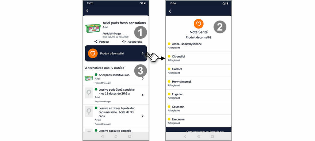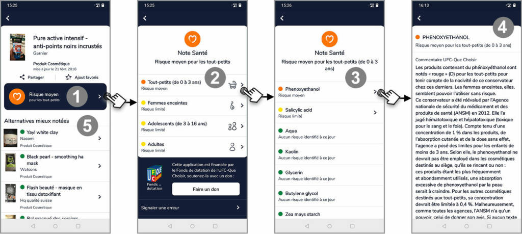 3 et 4 Un clic sur le nom de l’ingrédient donne accès à une explication sur les raisons de la nocivité de l’ingrédient.