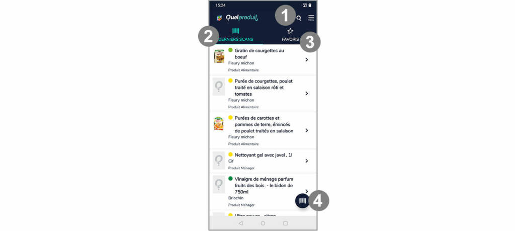 3 Accès à la liste des produits scannés favoris.