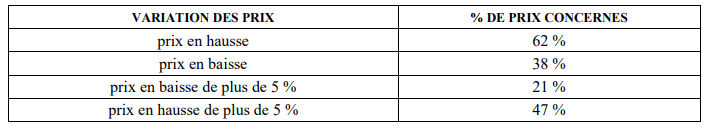 Le panier a augmenté de 4,9% entre septembre 2019 (contrôle des marges) et avril 2020 (marges non contrôlées), et a continué à grimper : +5,7% entre septembre 2019 (contrôle des marges) et novembre 2020. 62 % des prix ont augmenté depuis septembre 2019.