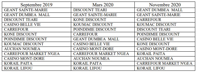 Les prix du panier indiqué sur le site du gouvernement prix.nc, comme correspondant aux produits les plus consommés (« panier PPC »(4) ont été relevés en septembre 2019, mars 2020 et novembre 2020 dans 13 magasins en Nouvelle-Calédonie : Auchan Nouméa, Carrefour Kenu In, Casino Belle-Vie, Carrefour Market N’Gea, Géant Dumbéa, Géant Sainte-Marie, Casino Mont-Dore, Discount Teari, Koné Discount, Korail Lifou, Korail Païta, Koumac Discount, Poindimié Discount (5) . Ce panier est différent de celui régulièrement analysé par notre association.