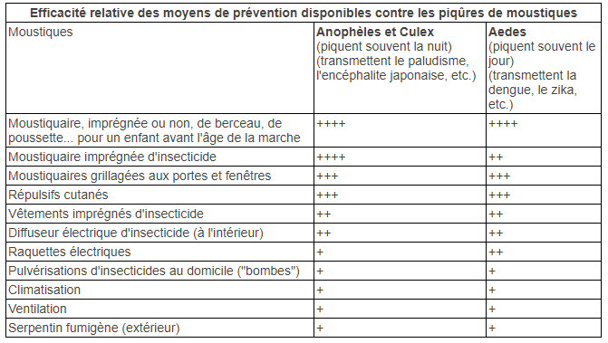 Le tableau ci-dessous vous donnera une idée de l’efficacité des différentes mesures de prévention relatives aux moustiques qui piquent la nuit ou le jour (++++ les plus efficaces ; + les moins efficaces).