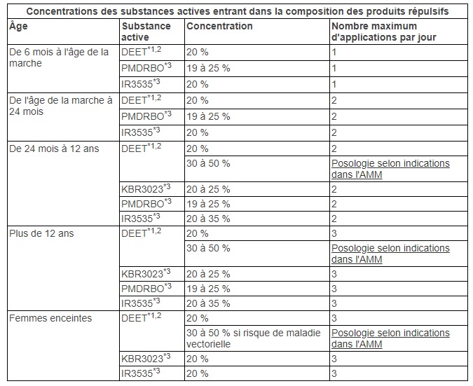 *1 En cas d’exposition aux anophèles vecteurs des Plasmodium, agents du paludisme, la concentration minimale efficace de DEET est de 30%.