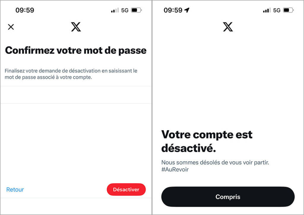 Vous devrez saisir votre mot de passe pour confirmer la désactivation. Si vous l’avez oublié, demandez la réinitialisation avant de lancer la désactivation du compte.