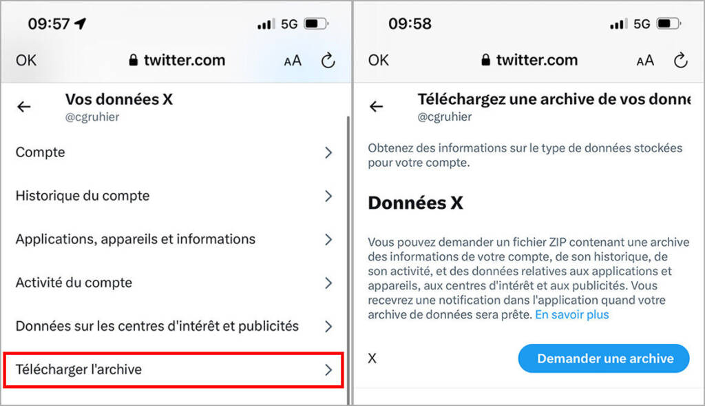 Notez par ailleurs qu’avant de désactiver votre compte, vous avez la possibilité de télécharger un dossier d’archives contenant vos anciennes publications, vos messages postés sur X. Là non plus, le résultat n’est pas immédiat. X prévient que la démarche peut prendre 24 heures. Vous recevrez ensuite un lien de téléchargement de votre archive par courriel. Ces données doivent être fournies dans un format « structuré, couramment utilisé et lisible par une machine » (une obligation du RGPD, article 20).