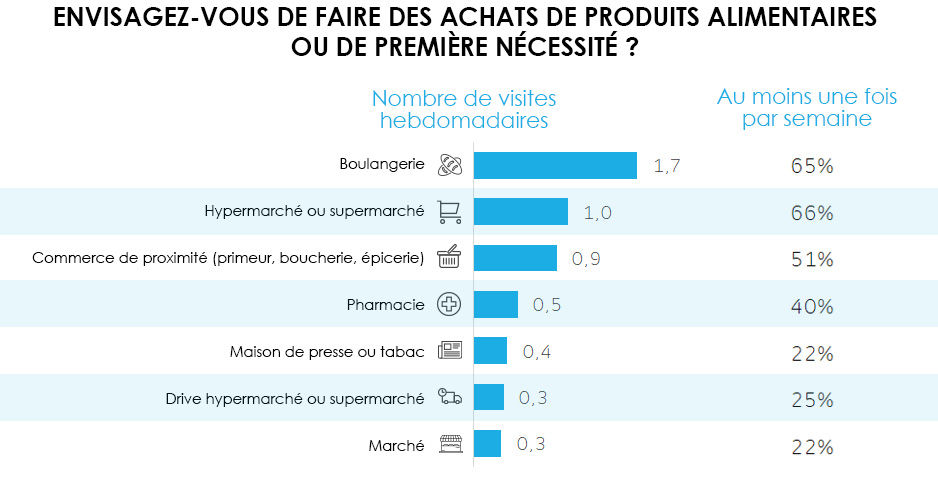 Pour les hypermarchés, supermarchés et magasins alimentaires, la fréquence des visites hebdomadaires annoncée est moindre : une fois seulement, dans la majorité des cas. Et depuis, au regard de l’évolution de la situation (augmentation des cas de coronavirus, mesures de confinement plus strictes…), nul doute que les intentions quant à leur fréquentation ont dû baisser.