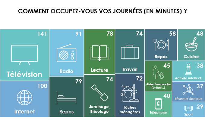 Lorsque l’on est cloîtré chez soi, le temps est forcément long. S’occuper devient alors une obsession. Le résultat de notre enquête est conforme à ce que l’on pouvait attendre. C’est la télévision qui arrive en tête des passe-temps. En moyenne, les participants à notre enquête la regardent 141 minutes. Ils surfent pas mal sur Internet (100 minutes) ou écoutent la radio (91 minutes). Bien sûr, on peut faire plusieurs choses en même temps ! Par ailleurs, en ces périodes où de nombreux salariés sont obligés de travailler depuis chez eux, nous avons voulu savoir le temps qu’ils y consacraient quotidiennement. Une indication est fournie en ciblant la tranche des 18-39 ans : c’est 186 minutes !