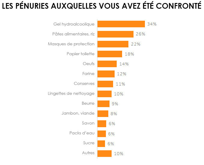 De nombreux reportages ont montré des rayons de grandes surfaces pris d’assaut ou vides ! Selon notre enquête, 47 % des participants disent avoir été confrontés à une pénurie d’au moins un produit. C’est beaucoup. Mais ce n’est pas aussi catastrophique que ce que certaines images pouvaient le laisser penser. Dans le détail, et sans surprise, ce sont les gels hydroalcooliques (34 %), les pâtes alimentaires et le riz (26 %) et les masques de protection (22 %) qui ont le plus manqué. La ruée sur le papier toilette est en revanche à nuancer : seuls 18 % des participants à notre enquête n’en ont pas trouvé dans le magasin qu’ils fréquentaient.