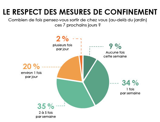 Dans plus d’une situation sur deux (51 %), les répondants sont confinés à deux. Mais une proportion non négligeable subit cette épreuve tout seul (28 %). En outre, les participants à notre enquête envisageaient-ils de sortir dans les 7 jours suivants ? 20 % ont répondu qu’ils le feraient tous les jours, 35 % de 2 à 5 fois. Et 9 % seulement ont assuré qu’ils ne sortiraient pas de chez eux, respectant ainsi le slogan maintes fois répété : « Restez chez vous ».