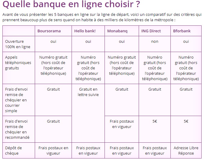 Avant de vous présenter les 5 banques en ligne sur la ligne de départ, voici un comparatif sur des critères qui prennent beaucoup plus de sens quand on habite à des milliers de kilomètres de la métropole :