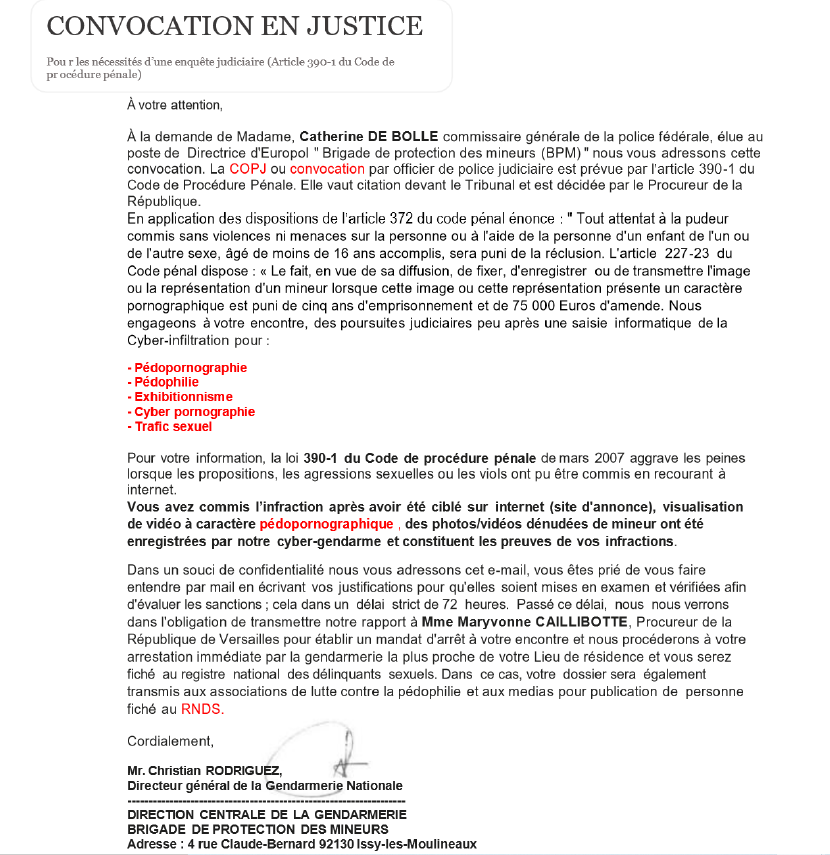 Depuis quelques temps, des consommateurs nous signalent avoir reçu un message à en-tête de la gendarmerie : il s’agit d’une convocation en justice pour les nécessités d’une enquête judiciaire, portant sur une culpabilité de différentes infractions sur des mineurs.
