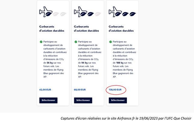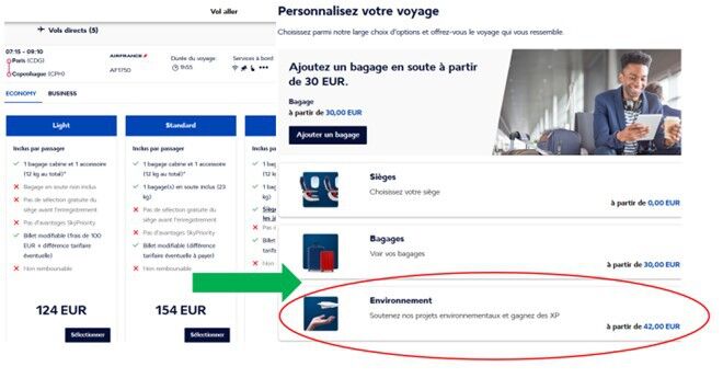 Air France – KLM a recours à cette pratique et propose aux consommateurs de souscrire des options onéreuses, pour supposément couvrir leur propre impact carbone, sur de futurs vols à horizon inconnu. Sur un vol Paris-Copenhague, un consommateur devra débourser la coquette somme de 138 euros, en plus de son billet, pour contribuer à cette prétendue future réduction de CO2.