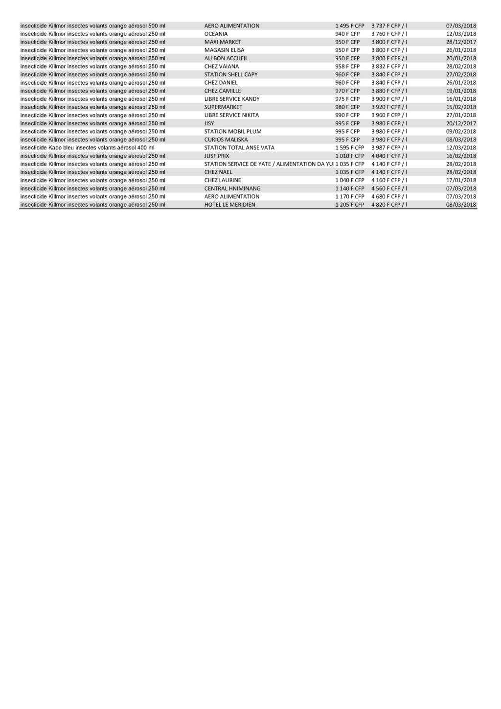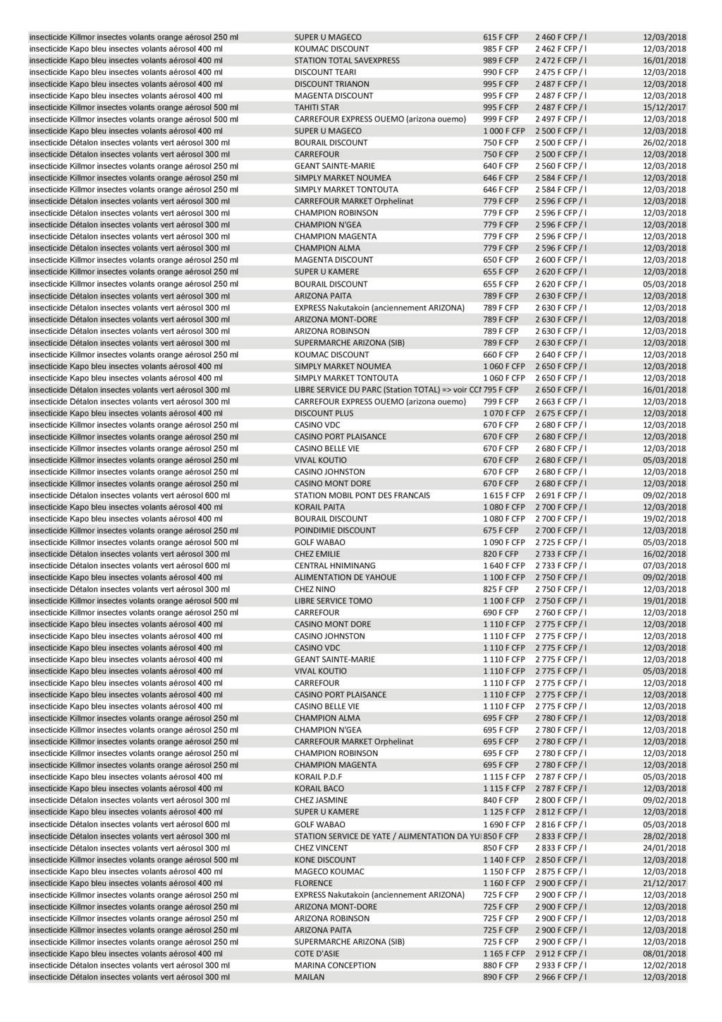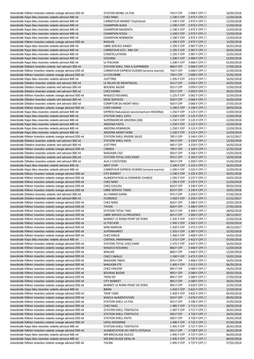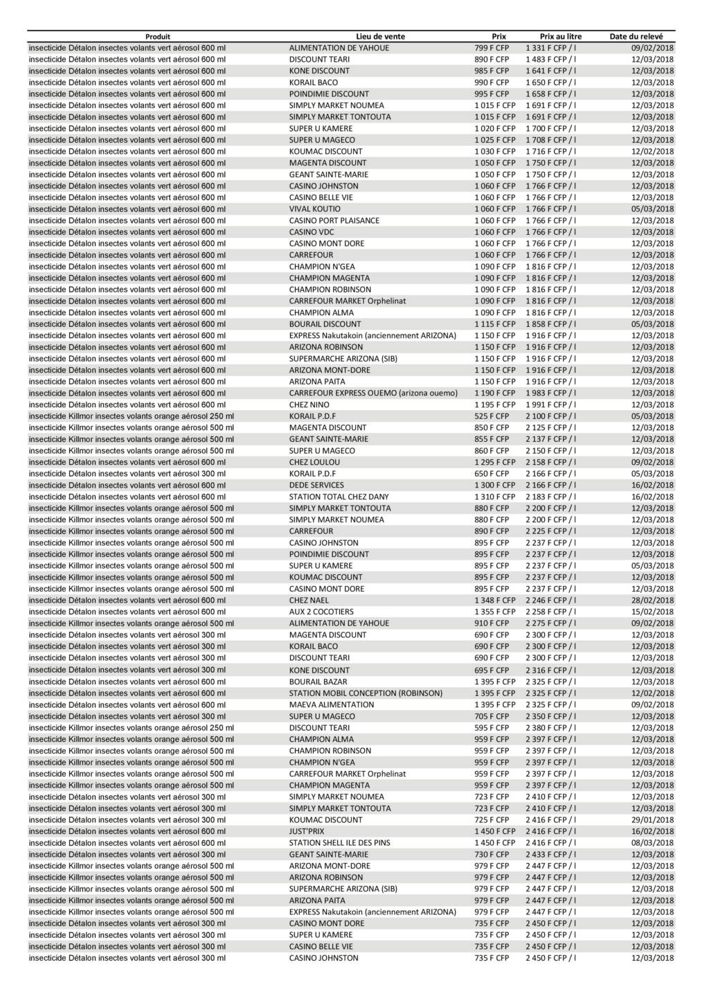 Le 14 mars 2018, nous avons extrait du site de l’Observatoire des prix de la Nouvelle-Calédonie (observatoiredesprix.nc) les prix des insecticides « insectes volants ».