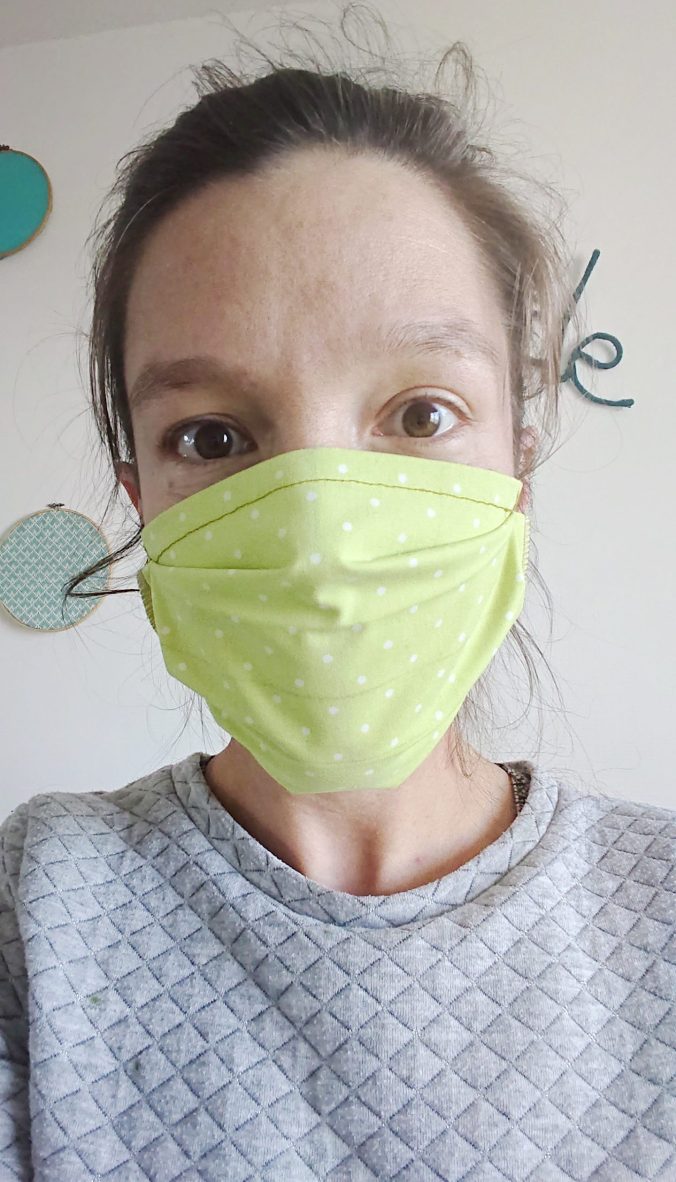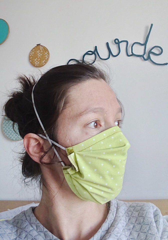 Voilà donc le fameux masque. Alors oui.. bon.. il est moins beau, il fait moins “fini” avec ses surpiqures apparentes, mais tout le monde aura compris que l’heure n’est pas à l’esthétique. Bonne nouvelle, il est super rapide à coudre. Je l’ai porté tout le temps passé à rédiger cet article et ce tuto. Il est particulièrement confortable en version élastique derrière la tête plutôt que derrière les oreilles. Il plaque bien.