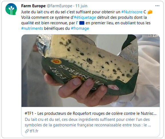 Exemple d’un message sur Twitter dénonçant le Nutri-Score et mettant en avant les bienfaits nutritionnels du fromage.