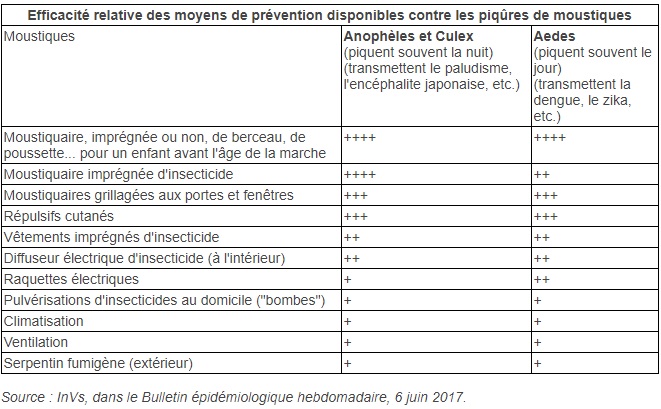 Le tableau ci-dessous vous donnera une idée de l’efficacité des différentes mesures de prévention relatives aux moustiques qui piquent la nuit ou le jour (++++ les plus efficaces ; + les moins efficaces).