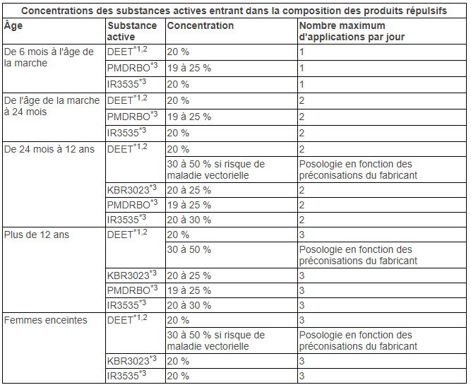 *1 En cas d’exposition aux anophèles vecteurs des Plasmodium, agents du paludisme, la concentration minimale efficace de DEET est de 30%.