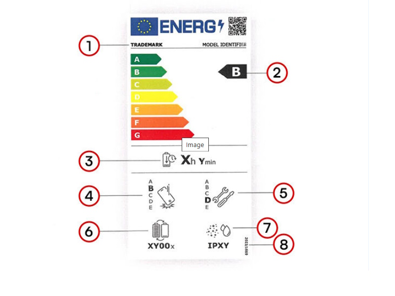 L’indice de durabilité est une initiative française. Or, pour les smartphones et les tablettes tactiles, un règlement européen prévoit l’entrée en vigueur d’une étiquette énergie à partir de juin 2025. Pas d’indice de durabilité pour ces produits, donc. À la place, cette étiquette énergie, similaire à celle apposée sur les appareils électroménagers ou les climatiseurs, renseignera sur différents critères :