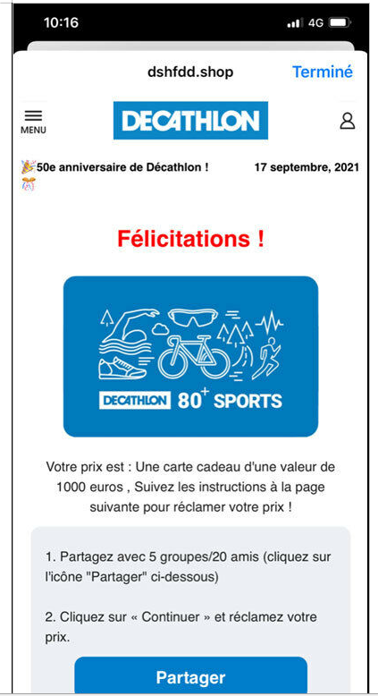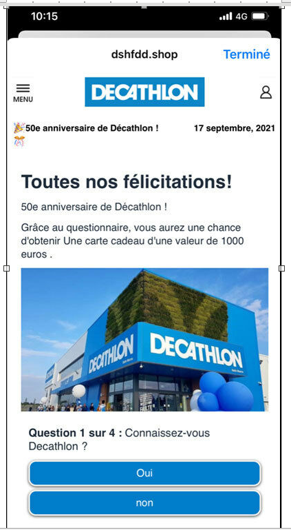 Pas plus qu’Amazon ne vend un vélo VanMoof à 2 €, Decathlon ne fête ses 50 ans ! Une nouvelle tentative de phishing, censée provenir de l’entreprise sportive, circule actuellement. L’enseigne, qui indique avoir remarqué une recrudescence de ces attaques depuis le début de la crise sanitaire, essaie de les limiter : « Il s’agit de tentatives d’arnaque totalement extérieures à Decathlon, que nous ne pouvons pas anticiper. Nous surveillons les réseaux sociaux et Internet. Dès que nous détectons [une arnaque], nous agissons le plus rapidement possible pour la rendre inaccessible, afin d’éviter le nombre de clics (plaintes aux réseaux sociaux, mises en demeure auprès des opérateurs techniques responsables de la mise en ligne des contenus). » Elle informe également les internautes de tels agissements sur son site et les réseaux sociaux.