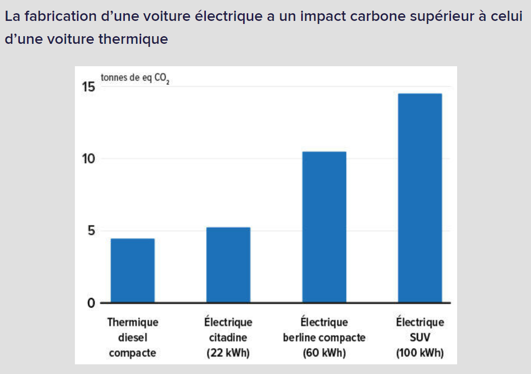 Pour commencer, une voiture électrique n’est jamais « zéro carbone ». Sa production, et notamment celle de ses batteries, émet des gaz à effet de serre (à l’origine du réchauffement climatique). Avant même d’avoir roulé le moindre kilomètre, une voiture électrique a donc une « dette » carbone de 5 à 15 tonnes équivalent CO2, selon les modèles. Cette empreinte est 2 à 3 fois supérieure à celle d’un équivalent thermique, indique l’Ademe.