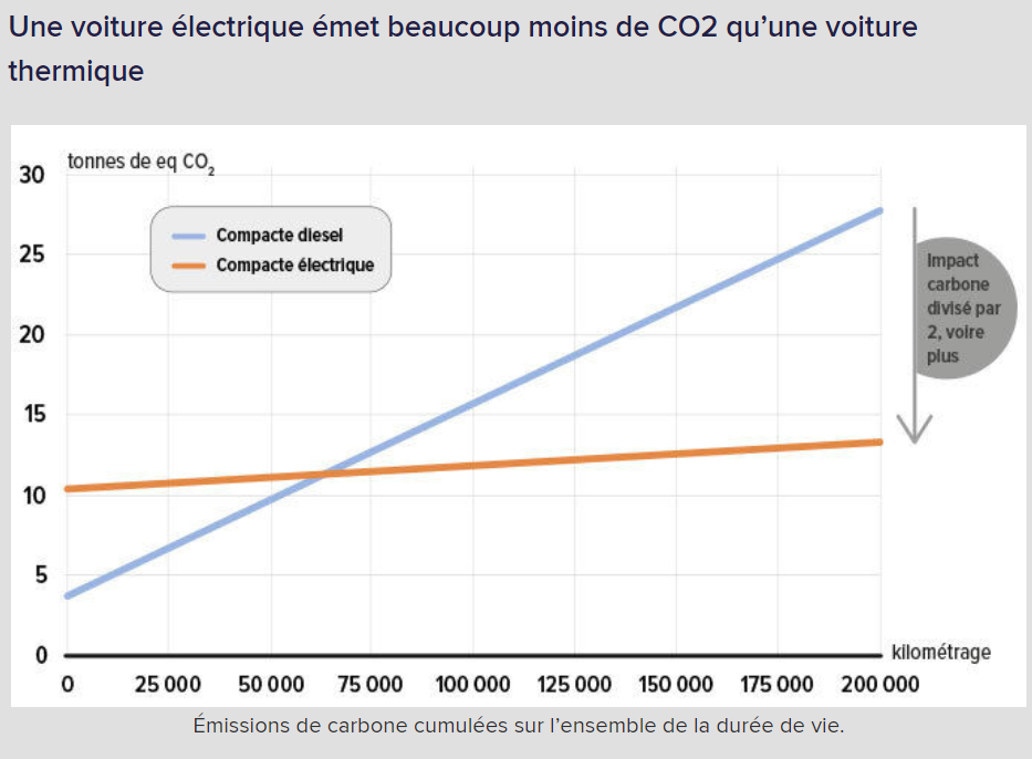 C’est donc à l’usage que l’intérêt de la voiture électrique apparaît. Logiquement, la voiture électrique émet incomparablement moins de CO2 qu’une voiture thermique qui roule en brûlant de l’essence. Ceci est particulièrement vrai si la production d’électricité est décarbonée (issue du nucléaire ou de sources renouvelables), ce qui est plutôt le cas en France, mais pas partout (si l’électricité est produite en brûlant du charbon, le gain est évidemment moindre). Au fil des kilomètres, la voiture électrique prend donc l’avantage en termes d’émission de CO2. Pour une berline compacte, le point de bascule se situe aux environs de 70 000 km.